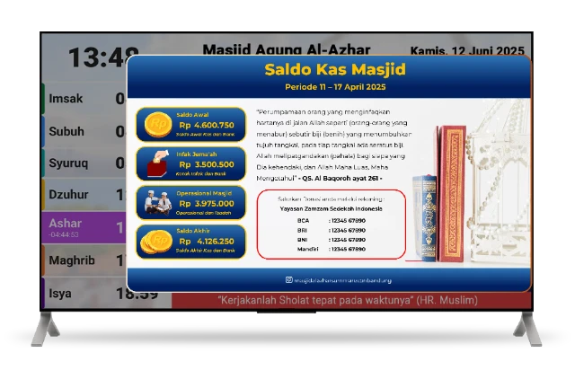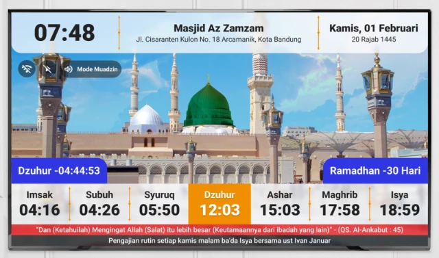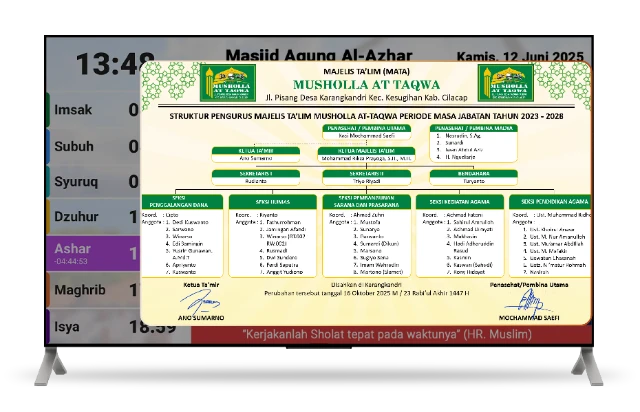 Buat jadwal shalat, informasi kegiatan, dan penunjuk waktu azan/iqamah jadi lebih jelas, tertib, dan profesional selama bulan suci Ramadan.
